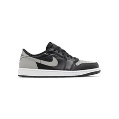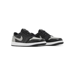 The 2024 edition of the Air Jordan 1 Retro Low OG 'Shadow' brings back an original colorway of Michael Jordan's debut signature shoe. Rendered in low-top form, the vaunted silhouette sports a leather upper, featuring a black base with neutral grey accents on the toe box, Swoosh, heel and back tab. The latter is stamped with the iconic Wings logo, while a woven Nike Air tag decorates the black nylon tongue. The sneaker sits on a white rubber midsole, fitted with an encapsulated Air-sole unit in the heel and supported by a grippy black rubber outsole.