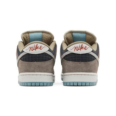 The Nike Dunk Low SB 'Big Money Savings' takes inspiration from big box stores and their discounted wares. Braided rope laces secure the mixed-material upper, featuring a tan canvas toe box with silver brocade quarter panels and taupe suede overlays at the forefoot and heel. In addition to a cracked leather Swoosh in an ivory hue, branding elements include a teal-colored Nike SB tongue tag and 'Nike' inscribed in crimson script on the canvas back tab. The interior tongue is appended with a tear-off receipt that announces 'Big Money Savings.' The sneaker is underpinned by a turquoise-colored rubber outsole.