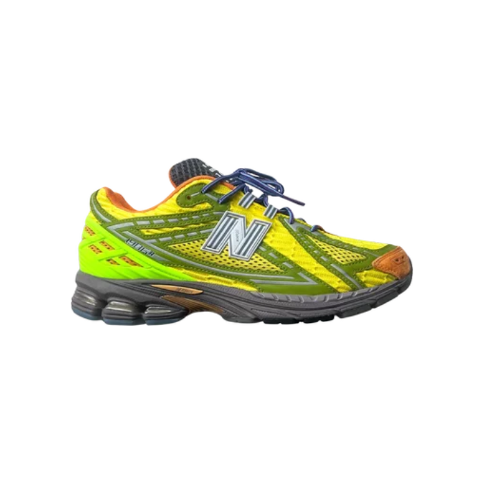 The Action Bronson x New Balance 1906R 'Scorpius' reunites the creative partners on a lush colorway of the lifestyle running shoe. Two-tone rope laces secure the upper, crafted from bright yellow mesh with lime green nubuck overlays and a TPU heel cage in a neon green hue. Rust colored accents land on the suede toe cap and textile collar lining. The sneaker is mounted on a dark grey ACTEVA LITE midsole with ABZORB SBS cushioning in the heel. A multicolor rubber outsole provides durable traction underfoot.