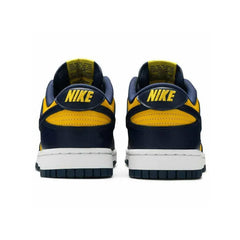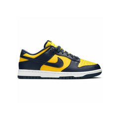 More than 35 years after its debut, the Dunk lows still deliver a bold, defiant style and remains a coveted look for crews across both sport and culture. Modern footwear technology brings the design's comfort into the 21st century in various colorways. The upper of the Nike Dunk Low Michigan is made of Varsity Maize leather with Midnight Navy overlays and Swoosh logos. A woven Nike label stitched to the tongue and “NIKE” text embroidered on the heel complete the design.