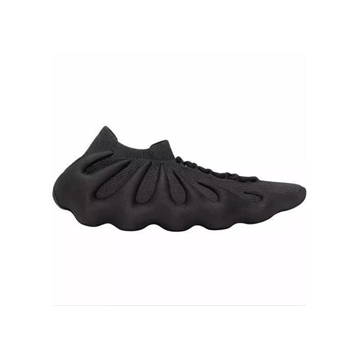The adidas Yeezy 450 ‘Utility Black’ tempers its unconventional design language with a stealthy one-note finish. The lightweight build utilizes a one-piece black knit upper, secured with lace closure and a stretchy, sock-like cuff. A color-matched PU-injected midsole wraps up the sides and heel, delivering a supportive fit with a one-of-a-kind aesthetic. Underfoot, the contoured outsole features grooved lines for superior traction.
